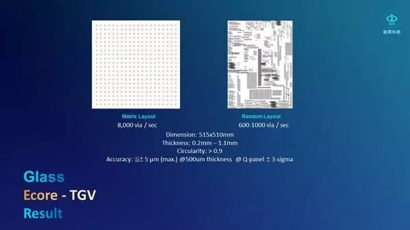 钛升掌握着关键自行研发的TGV技术,已能实现每秒8000个孔(8000 via/sec.,矩阵型)或每秒600至1000个孔(600~1000 via/sec.,随机分布类型)。
