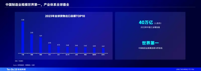 2023年中国工业增加值达40万亿人民币,同年货物出口额达3.38万亿美元,以明显优势位列世界第一。在世界经济复苏势头不稳的大环境下,这样的外贸成绩来之不易。