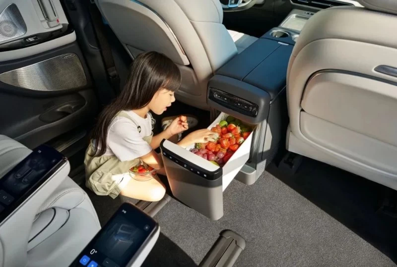 冰箱位于中控扶手处,容积13L,可存放10瓶350ml饮料,为用户提供充足的冷藏空间。拥有最低-6℃、最高50℃的智能可调温区,冷暖皆可,满足全家需求。具备多种智能控制方式,如二排智能扶手屏和冰箱控制面板,还支持24小时离车不断电。