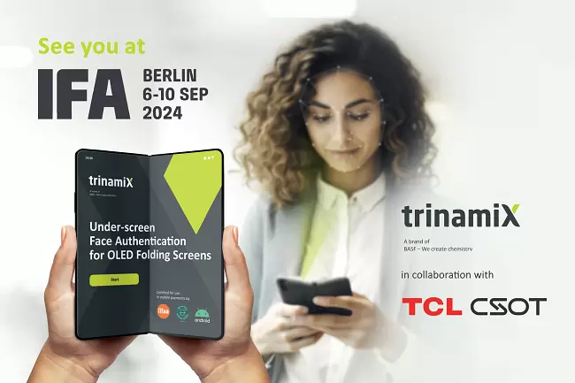 德国路德维希港,2024年9月2日——领先的生物识别解决方案供应商巴斯夫创迈思trinamiX与全球领先的显示解决方案提供商TCL华星合作,在2024年柏林国际电子消费品展览会(TCL展位H21-101)上展示其安全的人脸认证,该方案可隐藏式地集成在高端的手机折叠屏屏下,并适用于目前采用LTPO背板技术的OLED显示屏,在确保显示屏的性能表现的情况下,为用户提供了更强的安全保护和便利性。