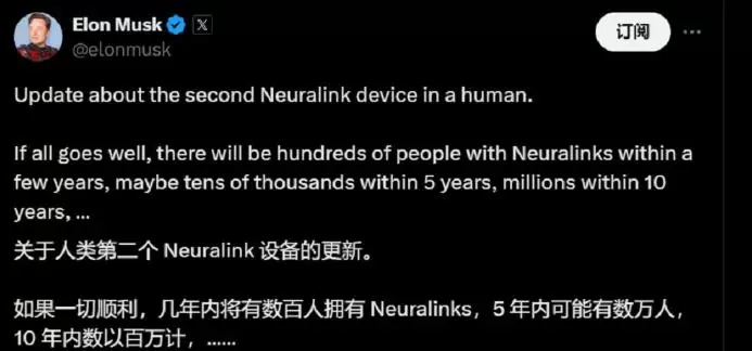 马斯克也转发了Neuralink公司的最新进展。他今天在X平台上预测,如果一切顺利,几年内将会有数百人拥有Neuralink,5年内可能有数万人,10年内数以百万计。