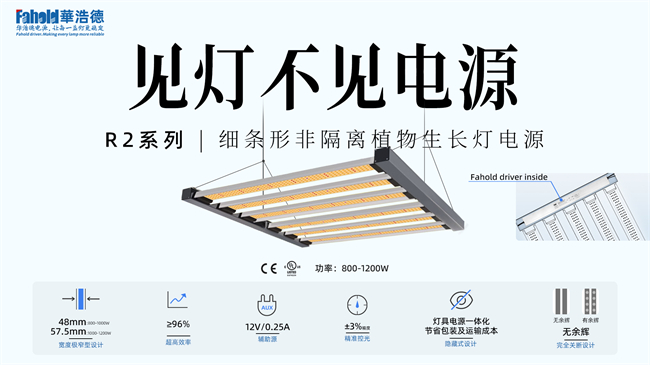 除此以外,越来越多的 LED 植物照明灯具兼备智慧功能,能够根据植物不同生长周期,灵活动态控制调配光谱。同时,在灯具设计上也更加倾向于模块化和多功能性,以满足各类不同环境和不同作物在不同的生长阶段所需的光谱。另外,简易安装和运输成本也是用户考量的重点。这些灯具产品变化也对LED 驱动电源和控制系统提出新的要求,包括功能和产品的物理形态。譬如,当前的LED植物生长灯市场均以出口为主,华浩德从灯具企业的视角出发,为了节省灯具的运费及包装成本,专门开发了纤细形的R2非隔离驱动,这种细条形电源可以内置于植物生长灯的二侧支架上,对灯具为而言,可以理解为是隐藏式设计。