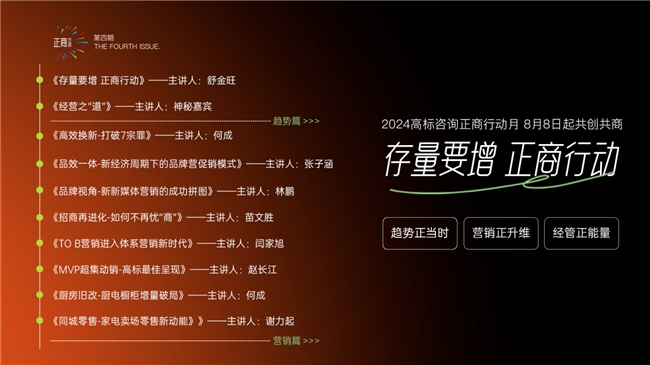 今年“正商行动月”结合多年市场经验和近几年总结企业端收到的各类问题,高标咨询整理定制了16节行业导师公开课,力在解决泛家居企业关心的“如何高效换新,实现新市场开发”“新经济周期下品牌改定制怎样的营促销模式”、“新媒体营销如何实现新增长”等等问题。