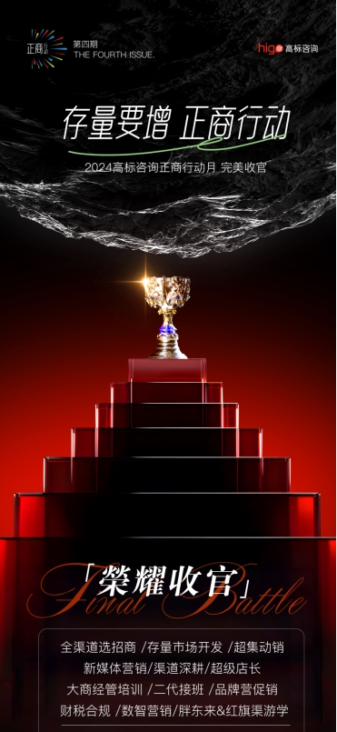 高标咨询秉承着严谨创新、奋斗进取、创造价值的品牌理念,不仅在动销、招商、培训等传统企业需求方面进行新环境背景下的升维精进,更是前瞻性的在2022至今的存量市场环境下,布局、深耕、实践及不断升级以旧换新/带教陪跑/渠道深耕/本地同城/新媒体矩阵/品牌营促结合等新服务维度的针对化/定制化的解决方案,并为客户直接/间接的创造了品牌的新质增长。
