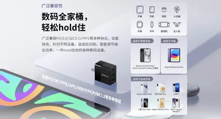 在充电效率方面,目前国内各品牌的快充技术往往都是私有协议且不对外开放,拥有多个数码设备的用户在出门时不得不多带几个充电器,thinkplus光影系列充电器广泛兼容PD3.0/QC3.0/PPS/HSCP/FCP等多种快充协议,确保市面上绝大多数电子设备都能获得快速、安全的充电体验。