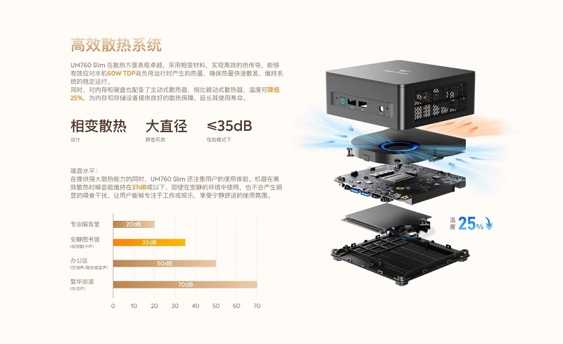 UM760 Slim采用了先进的相变散热技术,配备大直径静音风扇,能够在保持高效散热的同时将噪音水平控制在36dB以下,使UM760 Slim成为办公室的理想选择。