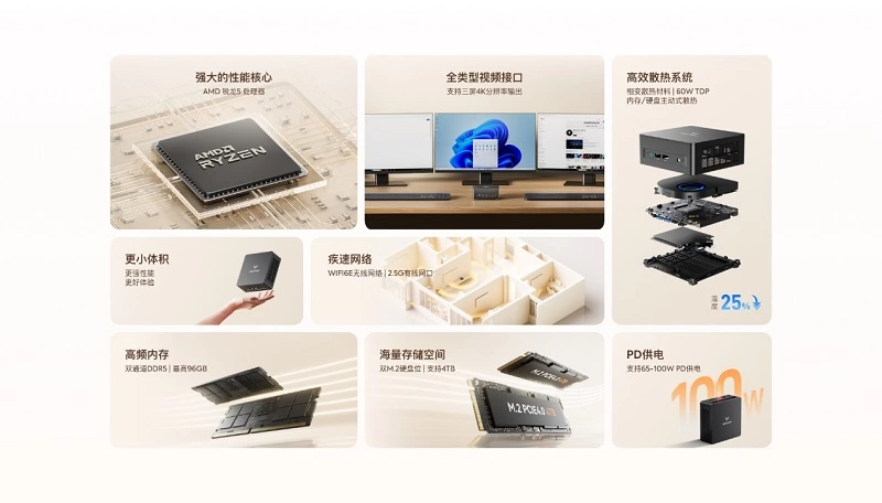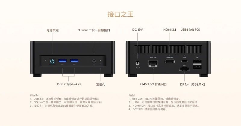 UM760 Slim提供了丰富的接口选项,包括USB3.2、USB2.0、USB4、HDMI 2.1、DP1.4等,支持最多三屏4K分辨率输出,满足多种外设连接需求。