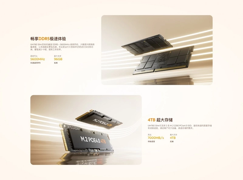支持双通道DDR5内存,频率最高支持5600MHz,最大支持96GB,保证了系统响应速度与多任务处理能力。同时,UM760 Slim支持两条M.2 2280 PCIe4.0 SSD,支持最高7000MB/s的传输速度,最大支持4TB存储空间,为用户带来闪电般的加载速度和充裕的存储空间。