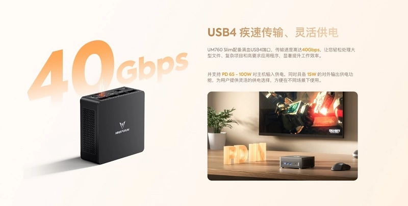 UM760 Slim 的USB4接口支持 PD(Power Delivery)65-100W 输入供电,可使用更便携的充电器或者通过显示器反向供电,此接口还具备 15W 的 PD 对外供电功能,可以为连接的设备(如便携屏)供电。