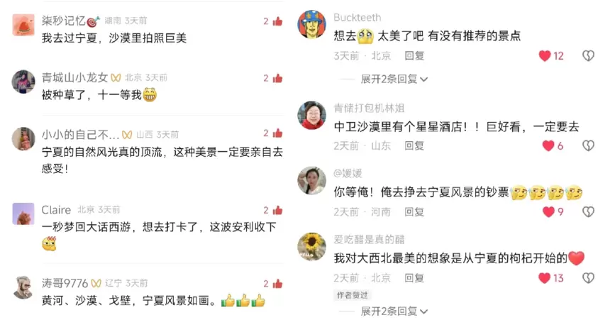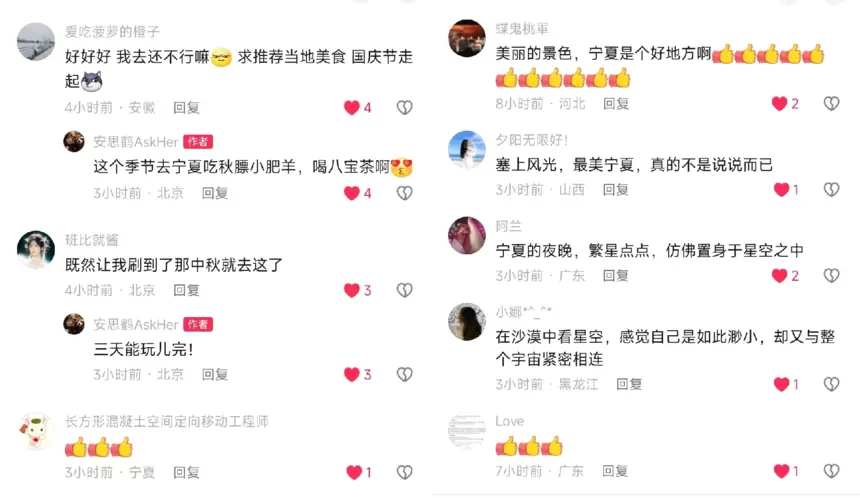可以说,天妤和安思鹤的宁夏之旅视频在网友中引发的积极反响,不仅提升了宁夏的旅游形象,也为文旅产业的数字化转型提供了新的思路和可能。