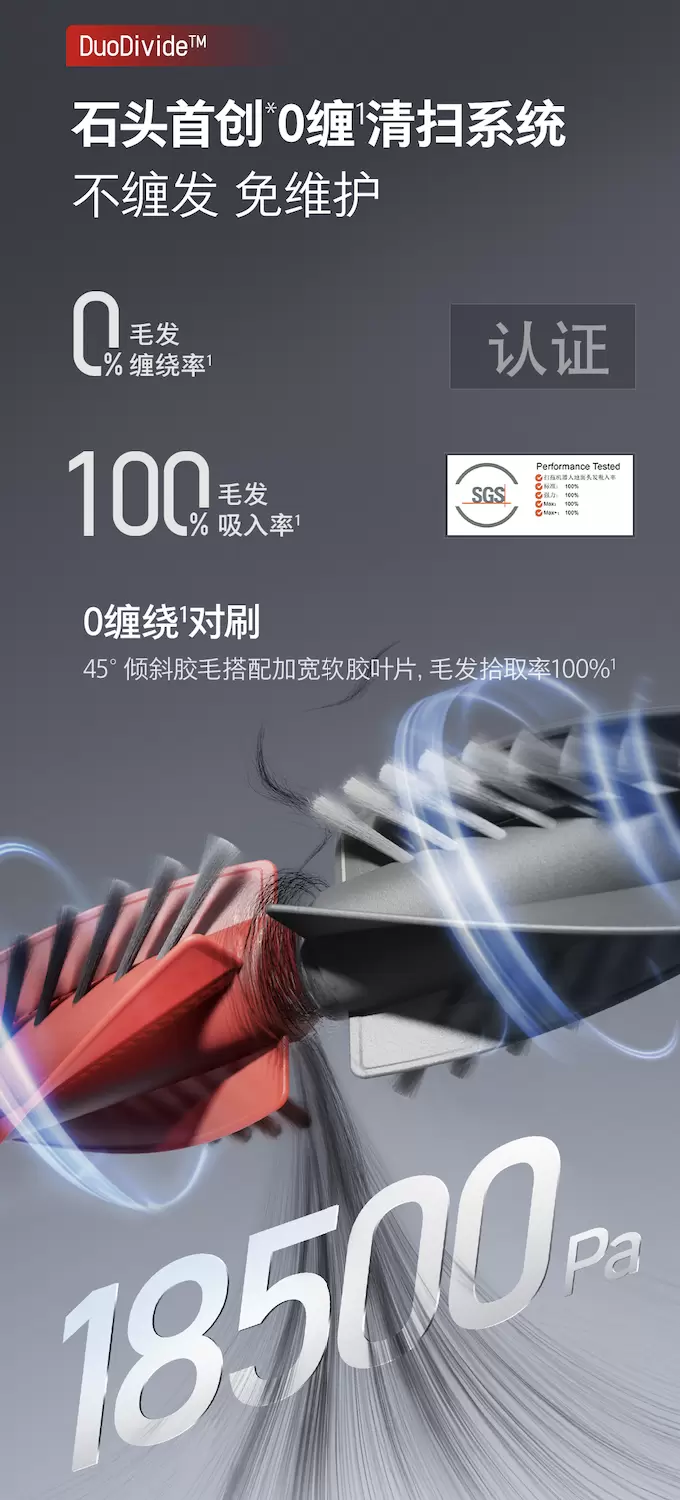 同时,石头G20S Ultra具备行业最高18500Pa飓风吸力,刷毛更长的边刷可以在更大范围内清扫毛发,拾取力更强的胶毛一体主刷高效卷入毛发,双悬臂对刷拖缠路径更短,配合45°倾斜V型螺旋设计可以将毛发向中间聚拢,同轴差速双刷将成束的头发剥散,最后通过强劲风力将毛发吸入尘盒。经SGS与TUV双重认证,G20S Ultra可实现毛发缠绕率0%,毛发吸入率100%。