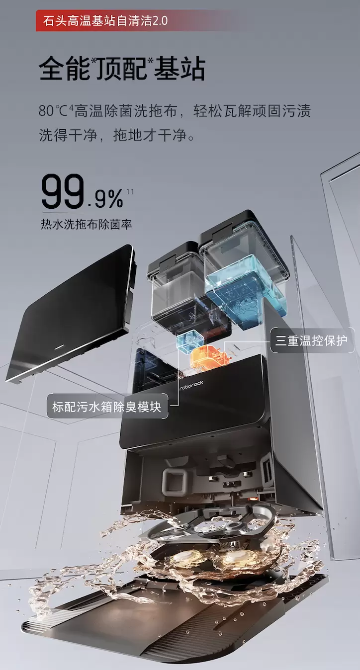 值得一提的是,石头G20S Ultra动态热水洗布功能迭代升级,洗布温度升至最高80°,轻松瓦解各种顽固污渍,标配污水箱除臭模块,无需担心污水箱发臭问题,全链路抑菌实现抑菌率99.9%。