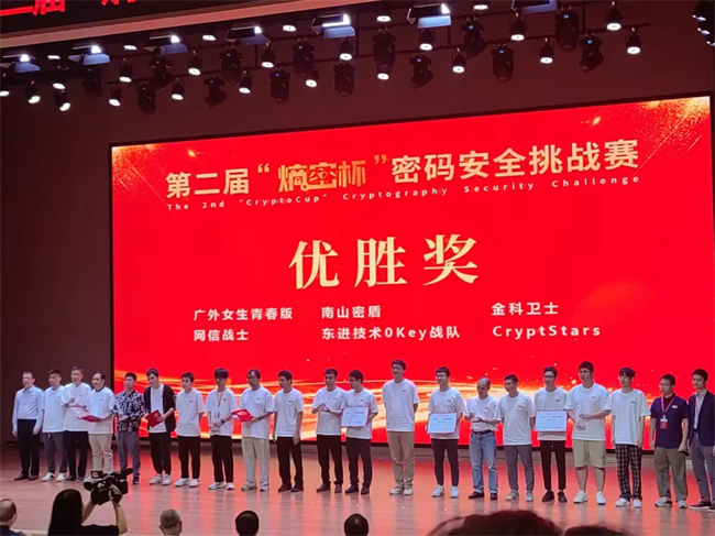 9月4日,由国家信息技术安全研究中心、密码科技国家工程研究中心主办的第二届“熵密杯”密码安全挑战赛在宁夏大学正式拉开战幕。由三位密码领域专业人才组成的东进技术0Key战队积极参赛、奋勇争先,最终以优异的成绩荣获第二届“熵密杯”密码应用安全挑战赛“优胜奖”。