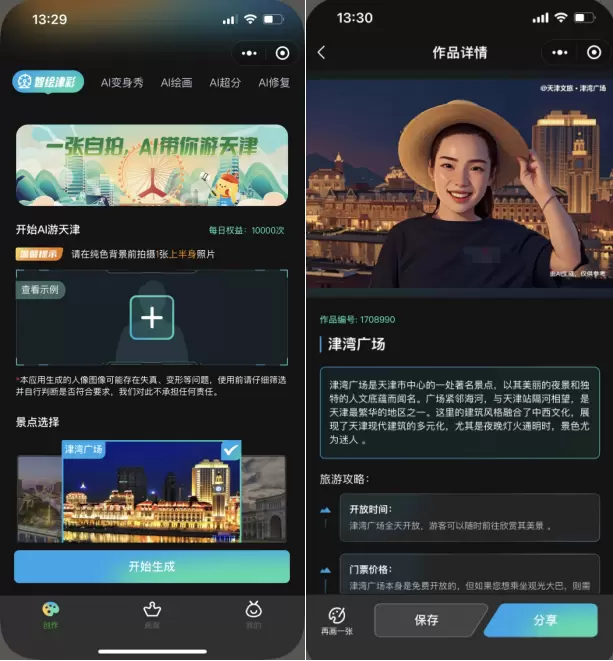 在蜜度N32-F03展位,还将有一场前所未有的智绘“津”彩AI互动。只需一张半身照,AI即刻带您穿梭于天津的名胜美景之间,享受一场身临其境的虚拟旅行体验。