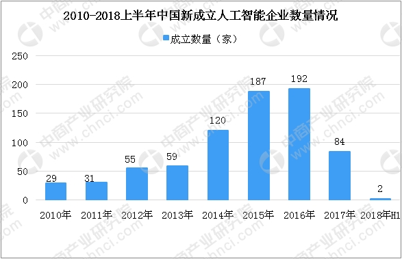 在中国人工智能企业方面,数据显示,中国人工智能企业超900家,达到922家,其中2016年新成立人工智能企业数量达到顶峰,为192家,2017年新成立企业数量为84家。