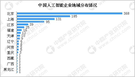 中国人工智能企业地域分布情况中,北京企业数量最多,企业数量为368家,其次为广东,人工智能企业数量为185家,排名第三的是上海,数量为131家。
