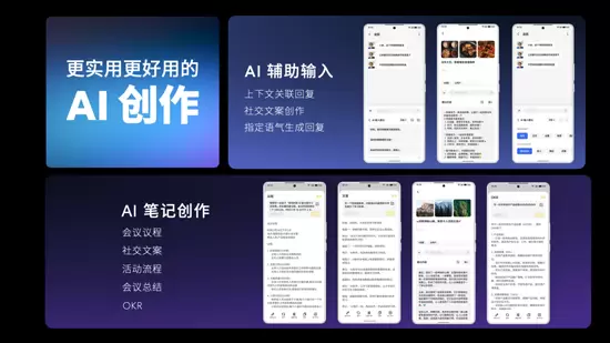 针对创作场景,AI 笔记创作功能支持生成会议议程、社交文案、活动流程、会议总结、OKR 绩效等不同文本输出,同时还支持进行笔记内容翻译和纠正;而 AI 辅助输入功能可根据信息内容智能联想,辅助用户高效输入内容,包括上下文关联回复、社交文案创作和指定语气生成回复等。