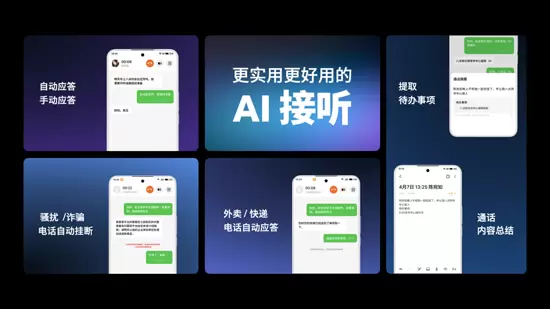 其中针对通话场景,AI 接听功能从接入智能判断开始,到挂断后的记录总结均能快速反应,并做到骚扰/诈骗电话自动挂断、外卖/快递电话自动应答、待办事项智能提取和通话内容生成总结等多项 AI 能力。