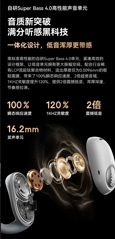 南卡OE PRO2搭载高标准高性能的自研Super Bass 4.0单元,紧凑高效的设计框架,让低音单元拥有更大振幅空间。配合行业稀有LCP流延钛聚合物材料,造出厚度仅为0.0096mm的极轻震膜,带来了100%瞬态响应速度,2倍超宽音域,1KHZ灵敏度提升120%,提供2倍震撼低音,浑厚深邃,节奏感拉满。搭配由南卡实验室主导,与20多名耳机发烧友、Hifi俱乐部共同研发,联合18位声学工程师参共同编制的Super Sound OS声学系统,结合了多项创新技术,如Q-Sonic量子音频还原引擎和FC超感知动态补偿系统,为用户提供了高达98.6%音质还原度的纯净音质。该OS系统经过精确调校和优化,实现了更完美的音乐细节和动态范围。借助先进的数字信号处理和声学模型,音频信号的传输和解码过程得到优化,使声音更加清晰、逼真和平衡。南卡OS声学系统还具有个性化定制能力,根据用户的喜好和环境条件实时调整和优化音频输出,确保音质的一致性和优质体验。