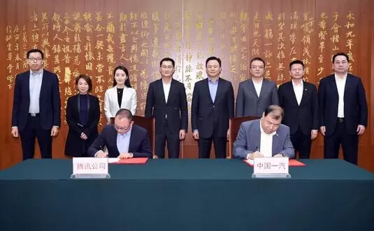 与此同时,腾讯与中国第一汽车集团有限公司签订战略合作协议,将面向场景研究、信息安全、车联网生态、云平台与大数据等领域,全力发挥各自优势,实现强强联合,共同推动双方全方位战略合作。