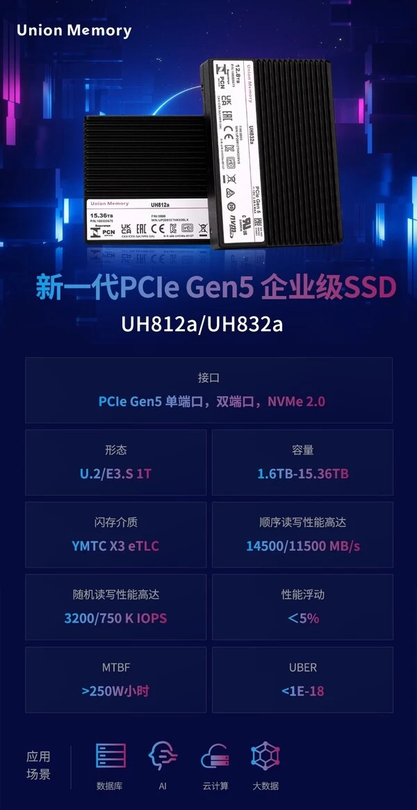 忆联PCIe Gen5企业级SSD忆联的PCIe Gen5企业级SSD UH812a/UH832a,作为面向AI数据中心和超大规模计算场景的先锋产品,较上一代实现翻倍性能,I/O性能和低延迟大幅提升。同时,该系列SSD采用了先进的DRAM缓存技术和智能算法,通过优化数据处理流程和降低写放大效应,有效提升了存储系统的整体效率和可靠性。