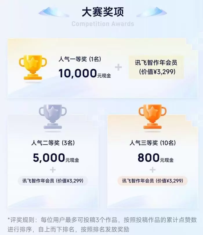 活动期间只要使用讯飞智作创作视频并带上 # 讯飞智作 #、# 讯飞智作首届智领 AI 创作大赛 # 发布抖音、小红书、视频号任意平台,将发布链接提交至大赛官网,即有机会赢得万元现金、数字分身定制、会员权益等多重好礼。参赛作品不局限虚拟形象使用,也可使用讯飞智作官网的虚拟主播声音。