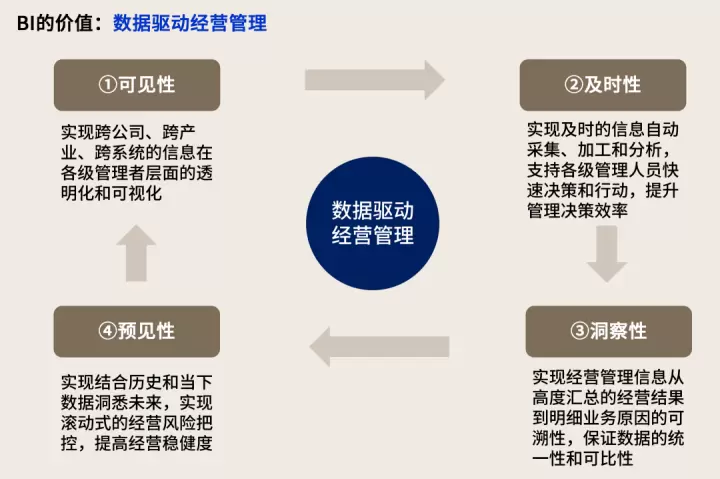 BI(Business Intelligence)暨商务智能,通过搜集和整合分布在海立各个系统中的海量业务数据,结合企业经营管理数据应用场景,让数据价值从可见性、及时性、洞察性、预见性四个方面逐层进阶,从而达到数据驱动经营管理的目的。