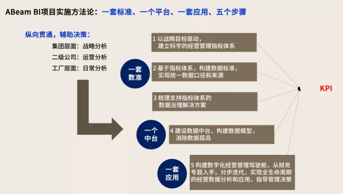 ABeam在各行业领域积累了丰富的实践经验并形成了独有的实施方法论。以一套标准、一个平台、一套应用、五个步骤来进行BI项目的实施交付。