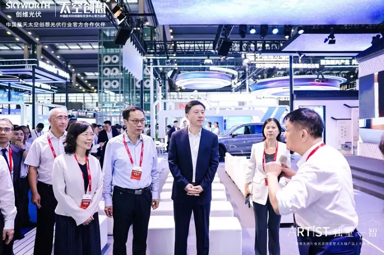 开幕仪式前,陶副市长与黄老板共同来到创维展台参观,此次活动创维光伏携三大新品亮相展台,以全系绿色科技产品,定义光伏能源革命。领导们对创维光伏此次产品做出高度评价,“艺墅家”以行业首款原装墅式光储产品全新亮相,以原装智造,成就高端新选。