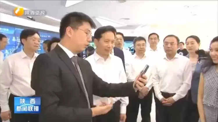 商汤科技董事长兼CEO徐立(前排左一)为陕西省委书记赵一德(前排左二)等领导介绍商汤前沿AI产品