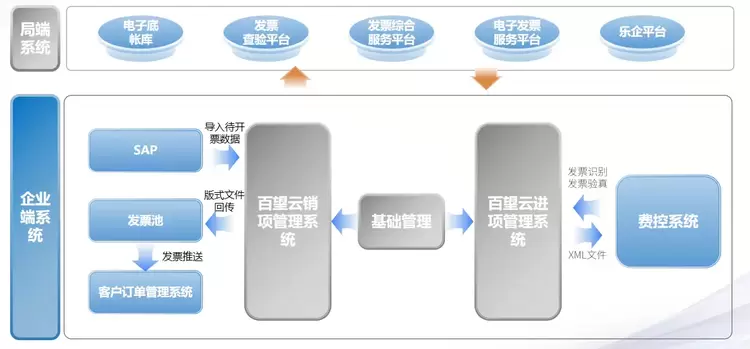从整体方案看,从SAP导出开票数据到百望云的销项管理系统,完成批量开票后,会自动将版式文件回传发票池,发票池会进行PDF、OFD、XML格式发票的保存,并推送到客户订单管理系统中。同时,发票在进入到企业的费控系统后,百望云进项管理系统会做OCR发票识别,完成发票验证,将合规的发票所对应的XML文件推送到费控系统中并进行保存。