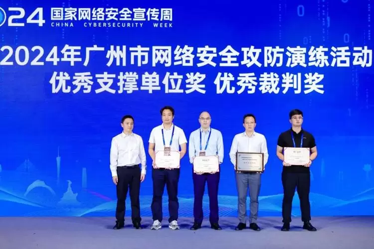 会上,绿盟科技技术专家被授予“2024年广州市网络安全攻防演练活动优秀裁判奖”称号,进一步体现了主管机构对绿盟科技技术实力的认可,同时也彰显了绿盟科技在企业社会责任承担方面的建设成果。