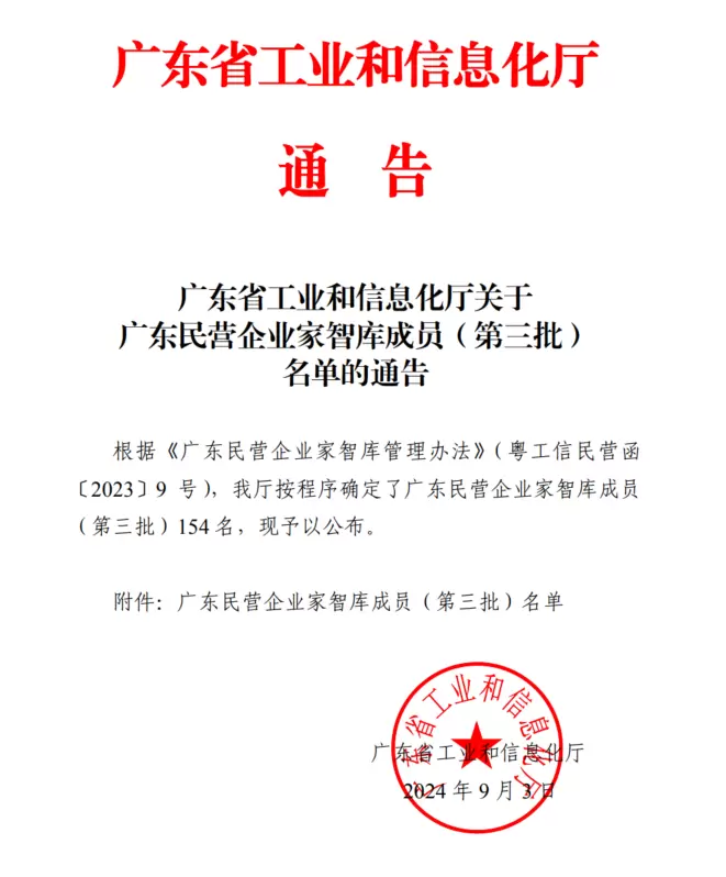 据悉,广东民营企业家智库是广东省工业和信息化厅为了充分发挥民营企业家建言献策的重要作用,持续提升广东省民营经济发展工作的科学化、规范化水平,助力全省民营经济高质量发展而组织设立的企业家资源库。入选的民营企业家,均来自广东省内各行业具有一定代表性的领军企业或骨干企业,且在该行业中具有一定知名度和影响力。