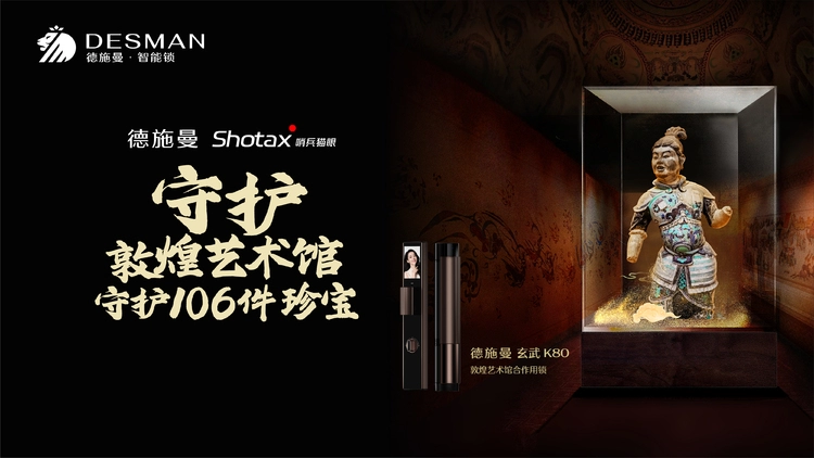 德施曼智能锁用颠覆行业的突破性技术Shotax哨兵猫眼系统,以全天24小时不间断抓拍的“真”猫眼,开启“德施曼珍宝守护计划”,首发站落地敦煌艺术馆;德施曼高端系列玄武·紫禁城K80也正式镇守敦煌艺术馆,以匠心工艺与顶配科技,守护106件珍宝。