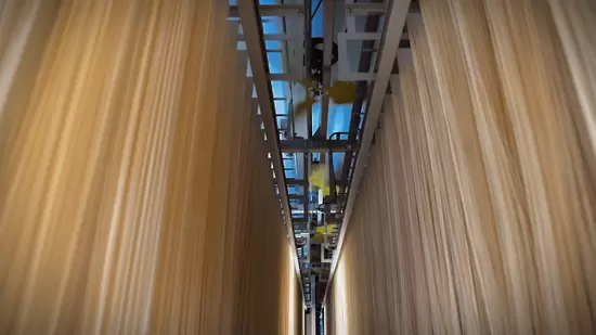 在智能化技术的加持下,旋擀仿生揉面机、渐缩压延分条机、双工位盘盆拉面机、绕杆机、步进提面机等设备相互协作,从初始状态下的面粉,到变为直径仅0.8-2mm的面条,期间和面、压延开条、盘盆醒面、旋转粗拉、二次盘盆醒面、旋转细拉、绕杆、面条醒面、提面拉伸、上杆、烘干、切断、包装等工序全部实现了自动化生产。