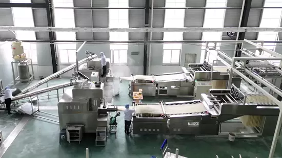 米粉的生产工艺比挂面要复杂的多,各地米粉品类不同、工艺不同,行业标准并不完善,所以研究的过程也复杂艰难许多。他们从稻米品质、工艺配方入手,对磨浆工艺、磨粉工艺、老化与烘房方式进行反复试验,确定了生产线的最优方案。2023年5月30日,世界首条全流程、全工段智能化米粉生产线在江苏投产运行,生产线完成了从配米制粉、制熟挤丝、老化松丝、自动搓散、节能干燥、切粉输送、称量包装的全过程自动化生产,是国内首条全流程直条米粉自动化生产装备,填补了米粉全产线关键工艺技术的国内外空白,是世界上首条产能最高、用工最少的智能化米粉生产线。