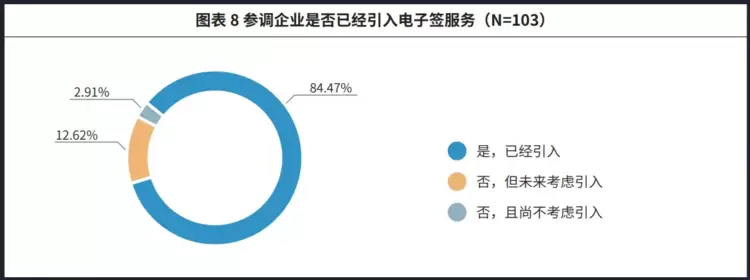 报告显示,本次参调企业中超8成企业已上线电子签,且绝大部分尚未引入电子签的参调企业也表示,考虑在未来引入电子签。