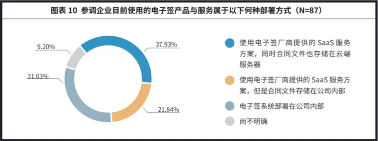 在部署方式方面,在已上线电子签的参调企业中,有近6成使用的是电子签厂商提供的SaaS服务方案,其中37.93%的企业选择将合同文件储存在云端服务器,21.84%的企业选择将合同文件储存在公司内部。同时,有超3成企业选择将电子签系统部署在公司内部。