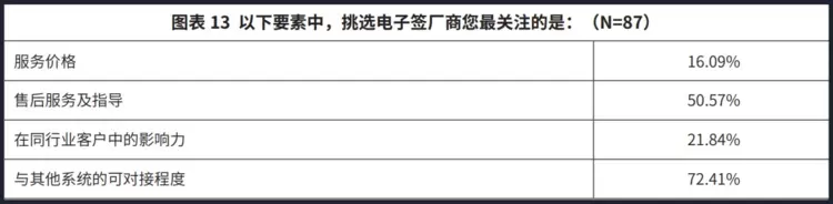 在电子签厂商选型方面,人力资源管理者对“与其他系统的可对接程度”和“售后服务及指导”的重视分别以72.41%和50.57%的占比远超其他因素,而这些均是会直接影响到电子签上线后,企业在使用便捷性的要因。从看价格看品牌,到看对接看售后,企业侧对电子签的应用正逐步成熟、逐渐深入。