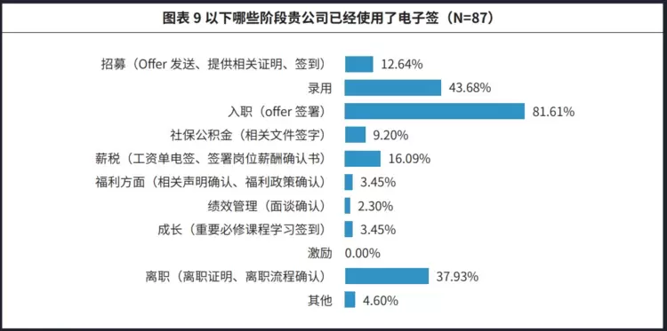在应用场景方面,企业在招聘和离职过程中采用电子签已成为常规做法。其中又以入职环节的“offer签署”为最高频使用场景,使用率达到81.61%。而除了在入转调离等基本场景的应用外,调研还发现一些公司已经开始将电子签应用于薪资税务和社会保险等领域,这表明电子签在人力资源共享服务中心的应用正在逐渐多样化。