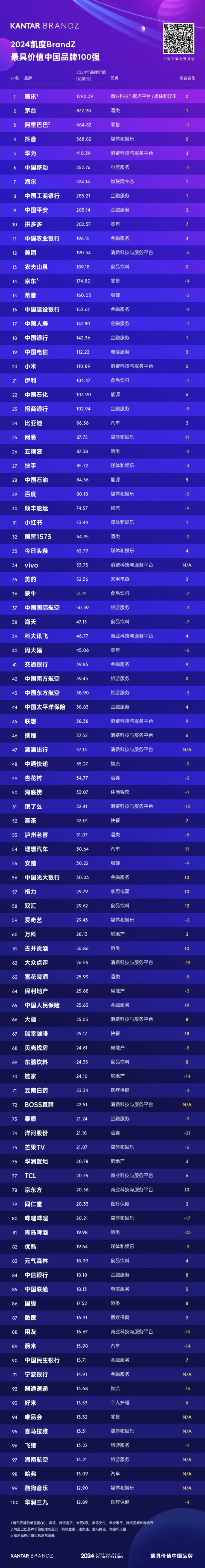 凯度BrandZ被誉为全球品牌界“奥斯卡”,是全球品牌价值权威指南,已调研全球54个市场超430万消费者,对532个品类形成了超过55亿个数据点。凯度BrandZ最具价值中国品牌百强榜通过“两步品牌估值法”得出,将品牌创造的“财务价值”乘以由消费者调查所获得的“品牌贡献”,并综合考虑“有意义、差异化、突出性”三大特征,得出最终的“品牌价值”。