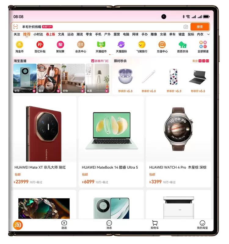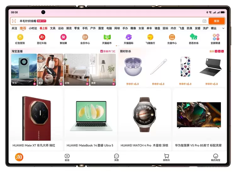 首先,用户在双屏态或三屏态的华为Mate XT非凡大师上使用淘宝App时,可在首页、搜索页等页面通过手势缩放调整展示的商品列数,这不仅能带来更为美观的商品排列方式,还使信息展示更加清晰,便于迅速对比多件商品,提升用户购物体验。