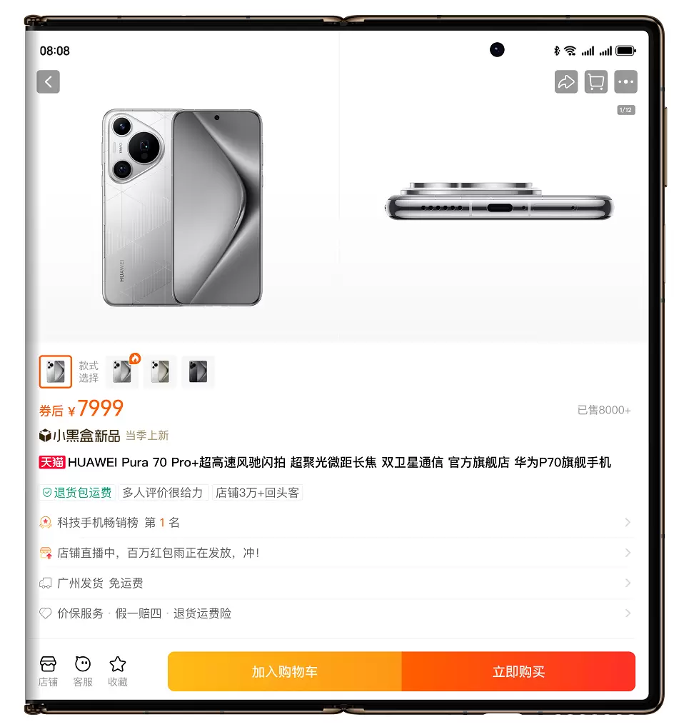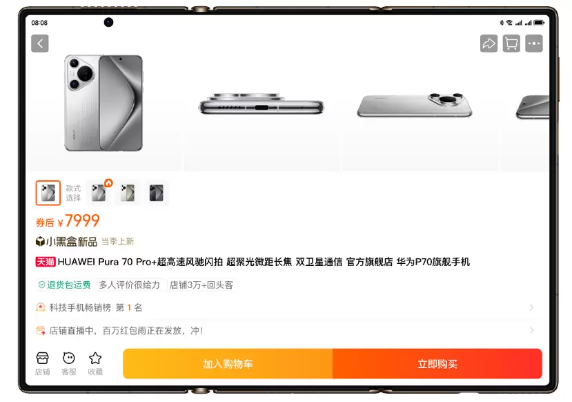 而且,淘宝App的商品详情页也特别针对华为Mate XT非凡大师的双屏态和三屏态进行了“深度改造”,通过适配不同尺寸、比例的屏幕,双屏和三屏时产品信息都一目了然。全新的主图连轴效果,可以在大屏页面同时展示多张商品图,用户无需频繁左右滑动即可获取商品关键信息,提高信息的展示效率和用户的逛买体验。