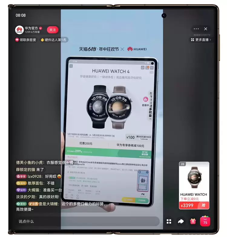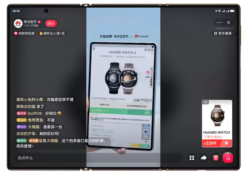 在双屏态或三屏态的华为Mate XT非凡大师上,淘宝App对直播界面布局进行了全面优化,通过合理划分直播画面、弹幕和宝贝口袋区域。结合10.2英寸华为临境大屏和3K超高分辨率,直播观看体验更沉浸、更生动,用户能够更畅快地“边看边买”。