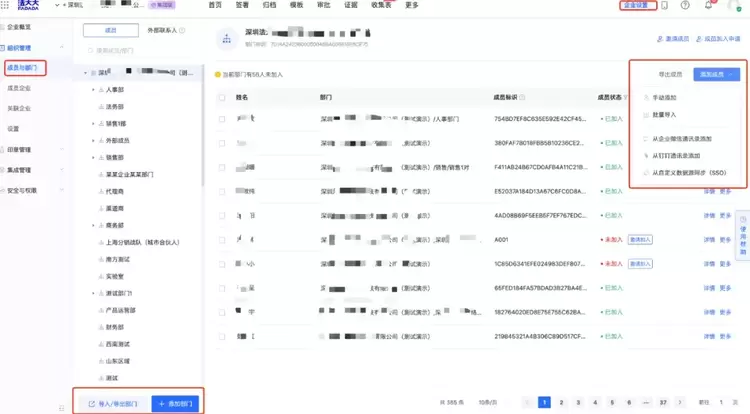 1. 第一步:在企业实名认证后,打开企业设置,配置组织架构;1)可进行部门的导入导出;2)添加成员:可手动单个添加也可批量导入,同时支持企微、钉钉等第三方导入。