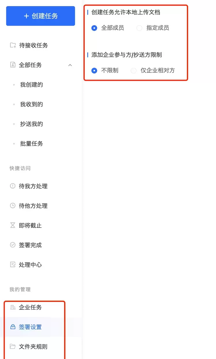 现在:只需在业务系统中,给HR部门设置单独权限,并基于岗位职责给各位HR和管理者设置相应权限、数据范围、可选择发起的模板文件等即可。例如,HR方面可查看的数据范围一般为与自己相关的(我创建的,发送给我的,抄送给我的),HR部门主管则通常配置部门内所有人权限范围内的所有合同数据。