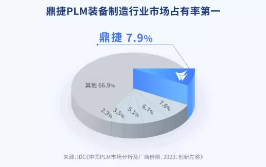IDC报告数据显示,2023年的PLM市场规模排名前三的行业是高科技电子及计算机通信、装备制造、整车及汽车零部件。其中,鼎捷强势领跑装备制造行业PLM,市场占有率达7.9%,位列第一。