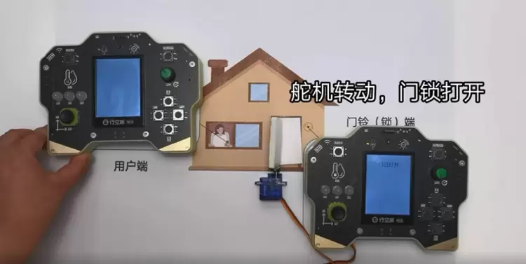 * 功能:模拟用户利用物联网开锁功能,即按下用户端A键,远程控制门锁端舵机转动模拟门锁打开。
