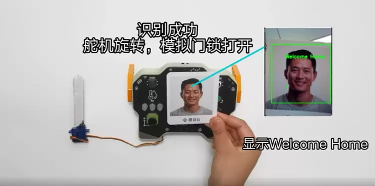 * 功能:行空板信息科技实验盒摄像头识别人脸卡片,当识别是已录入的人脸,舵机转动打开门锁,否则门锁保持关闭。