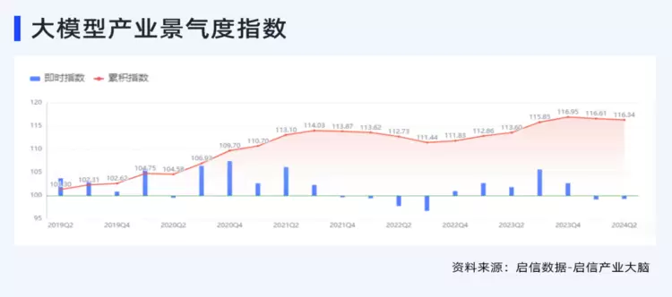 围绕大模型产业当前发展形势,启信数据建立了一套量化评价指标,对大模型产业发展和企业潜力做出评估,帮助政府、银行等机构做好精准投资和产业扶持。景气度指数是用于反映产业发展景气情况的指数,当指数高于100时,表明产业发展上行;低于100时,表明该产业发展放缓或下行。目前来看大模型产业链的整体健康状况良好,并在快速成长后逐渐趋于稳定。